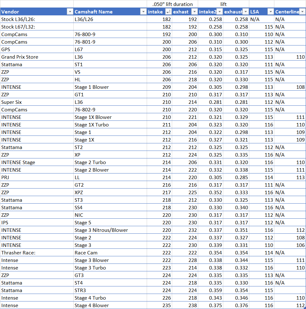 | Vendor | Camshaft Name | intake | exhast | intake2 | exhaust | LSA | Centerline |